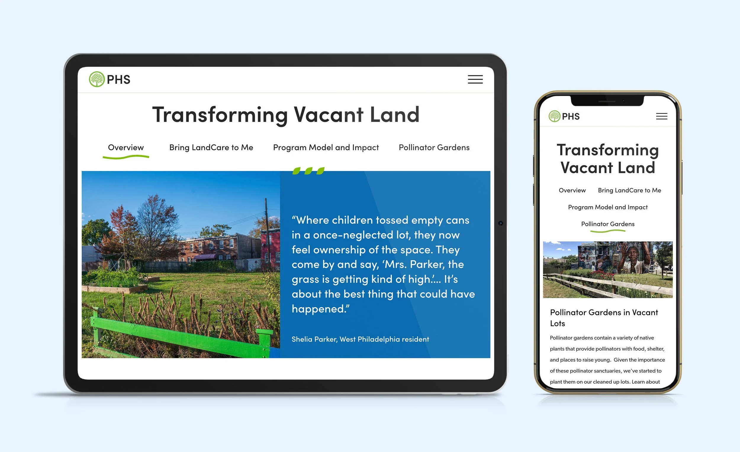 The Pennsylvania Horticultural Society (PHS) is a nonprofit organization that leads greening initiatives in the Greater Philadelphia region. As an evolving designer on the Marketing Team, I pioneered multimedia content into the team’s strategy and spearheaded the creation of their latest website.